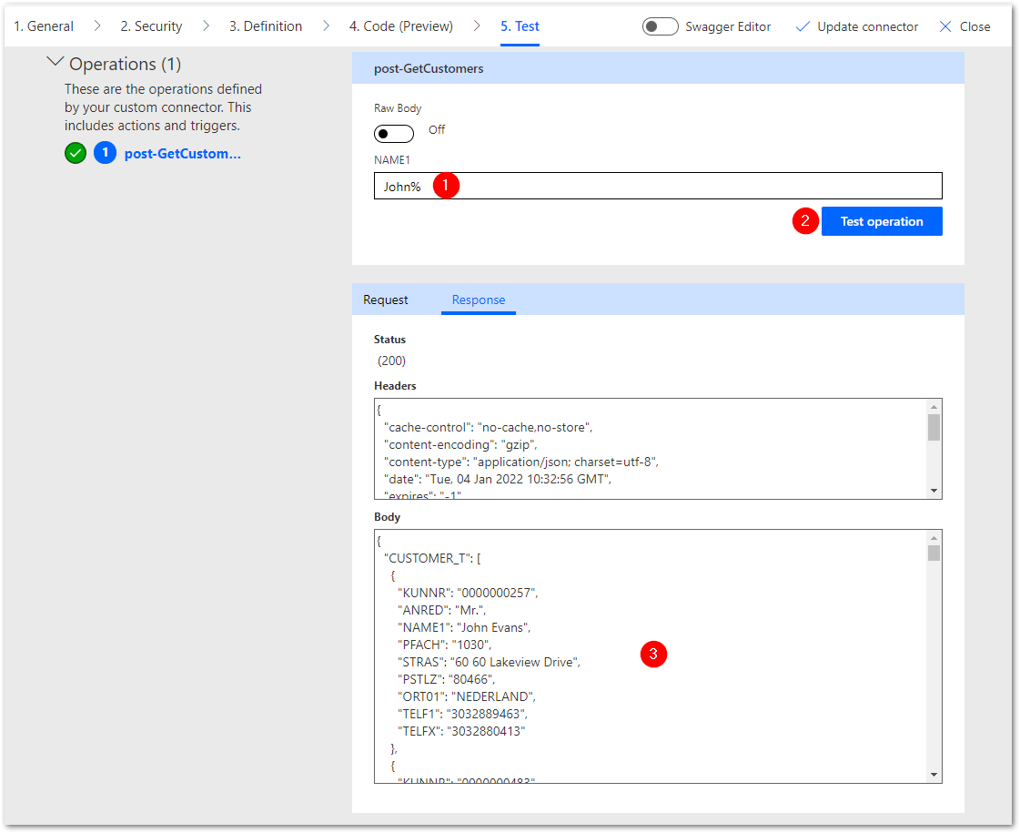 - Navigate to the Test tab of the custom connector.