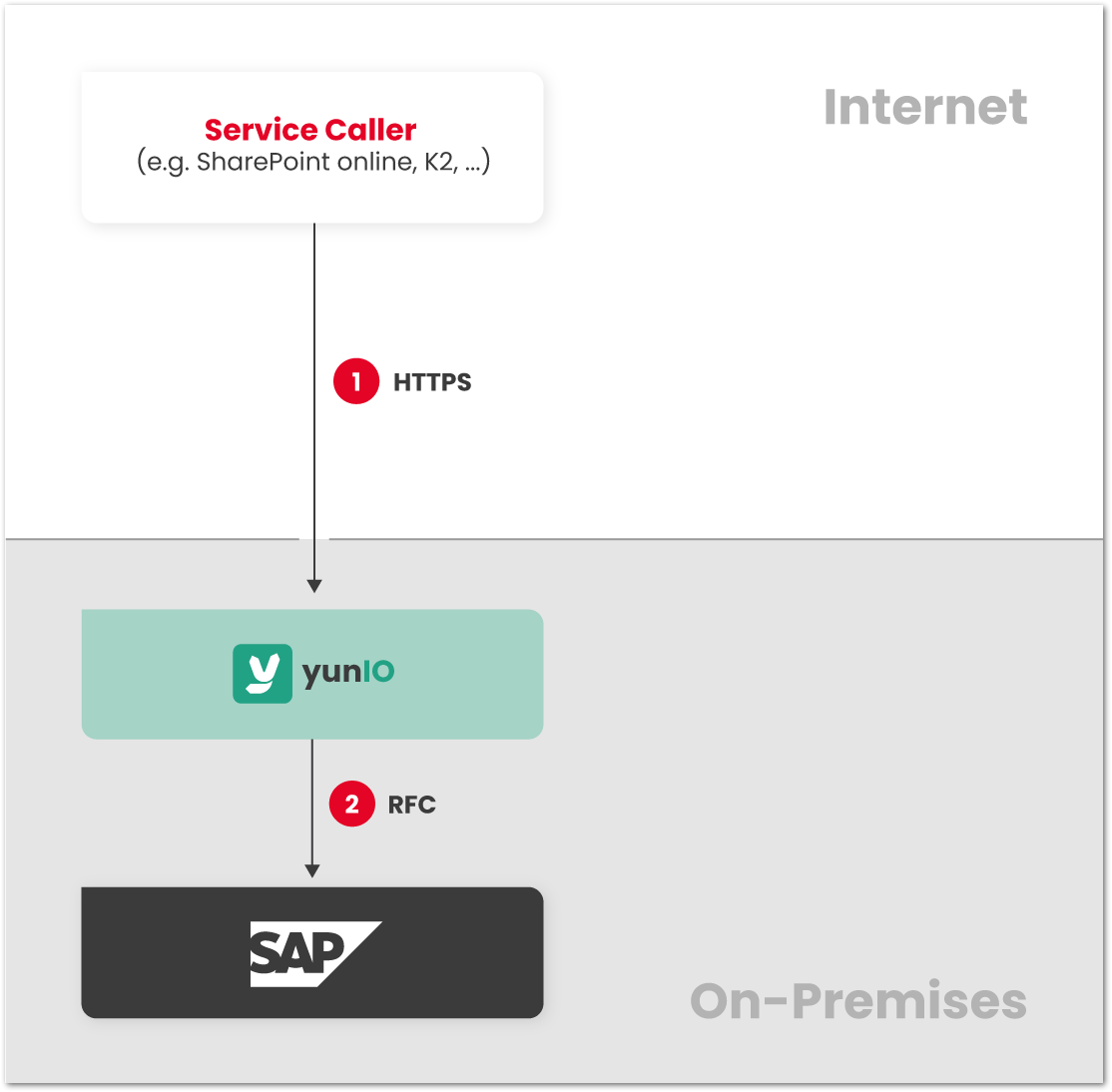 - Caller is located on-premises, yunIO and SAP are located in the cloud.
